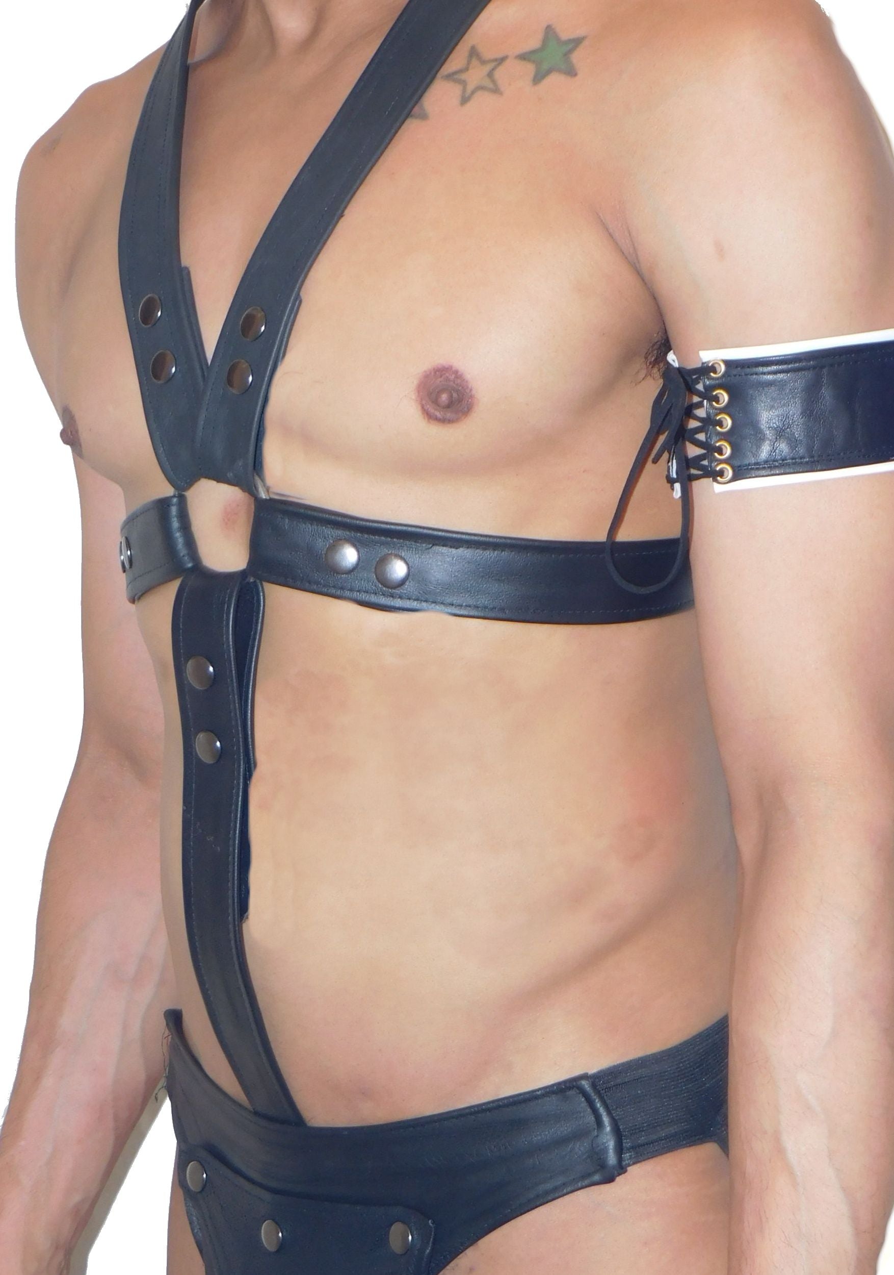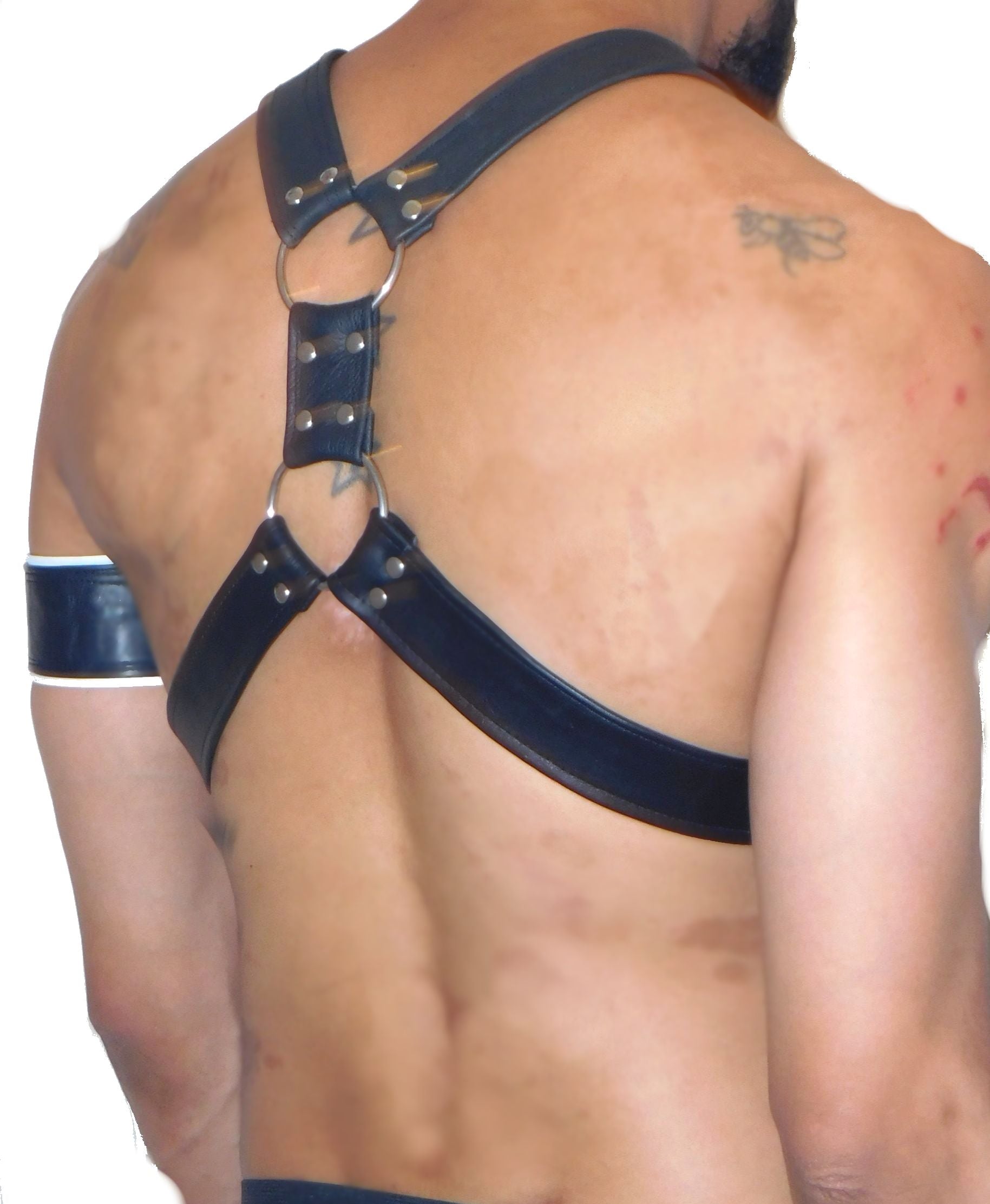 Leather Straps and it forms an X in front like our X leather harness. It's comfortable and adjustable. We added a removable strap that snaps in your C- ring.