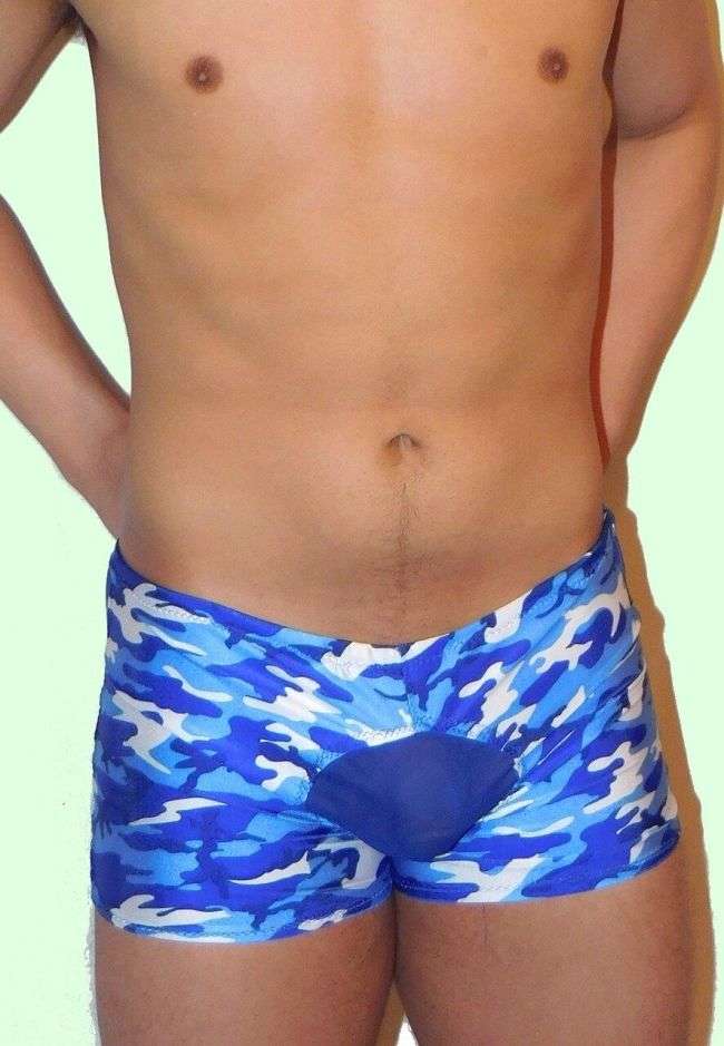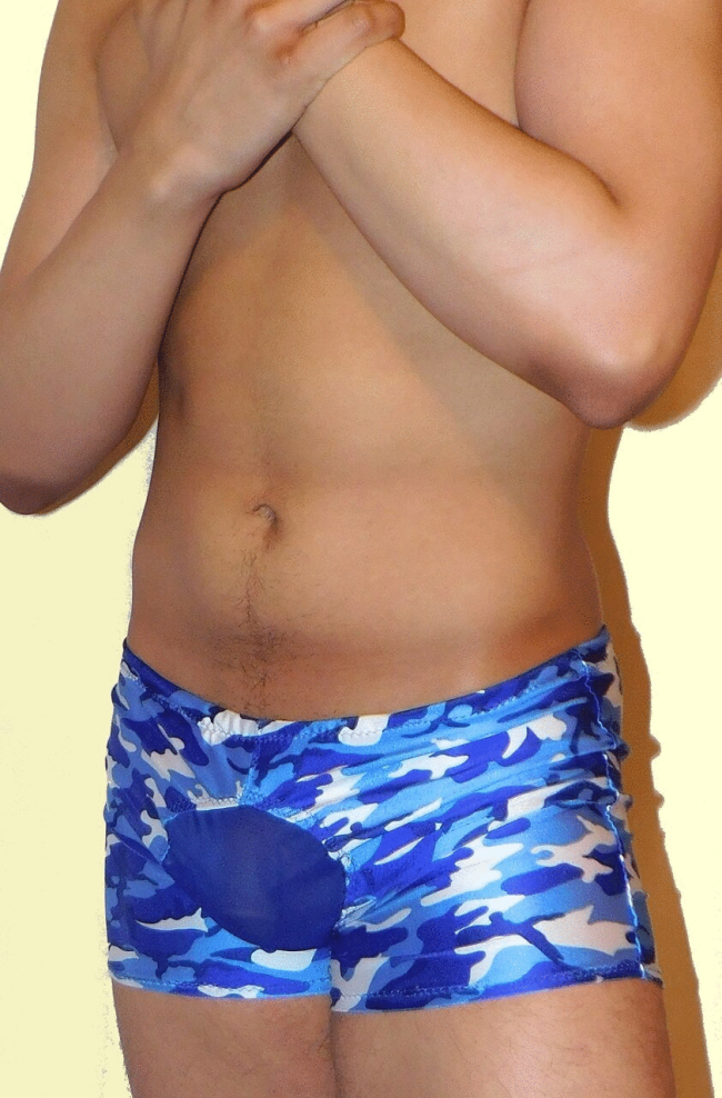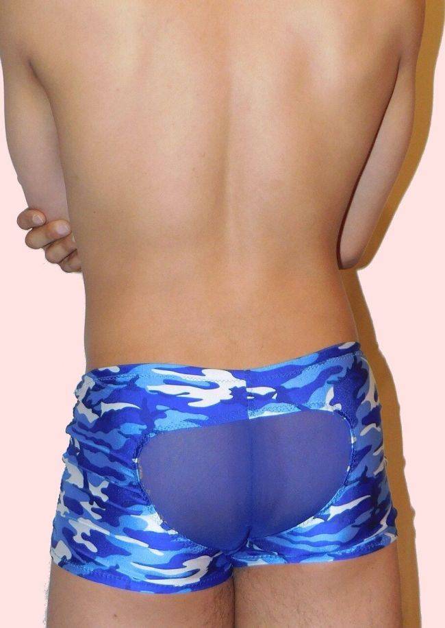 Soft camouflage spandex fabric in a snug fitting brief short. The surprise is the sexy black mesh cut-outs in front and in back.