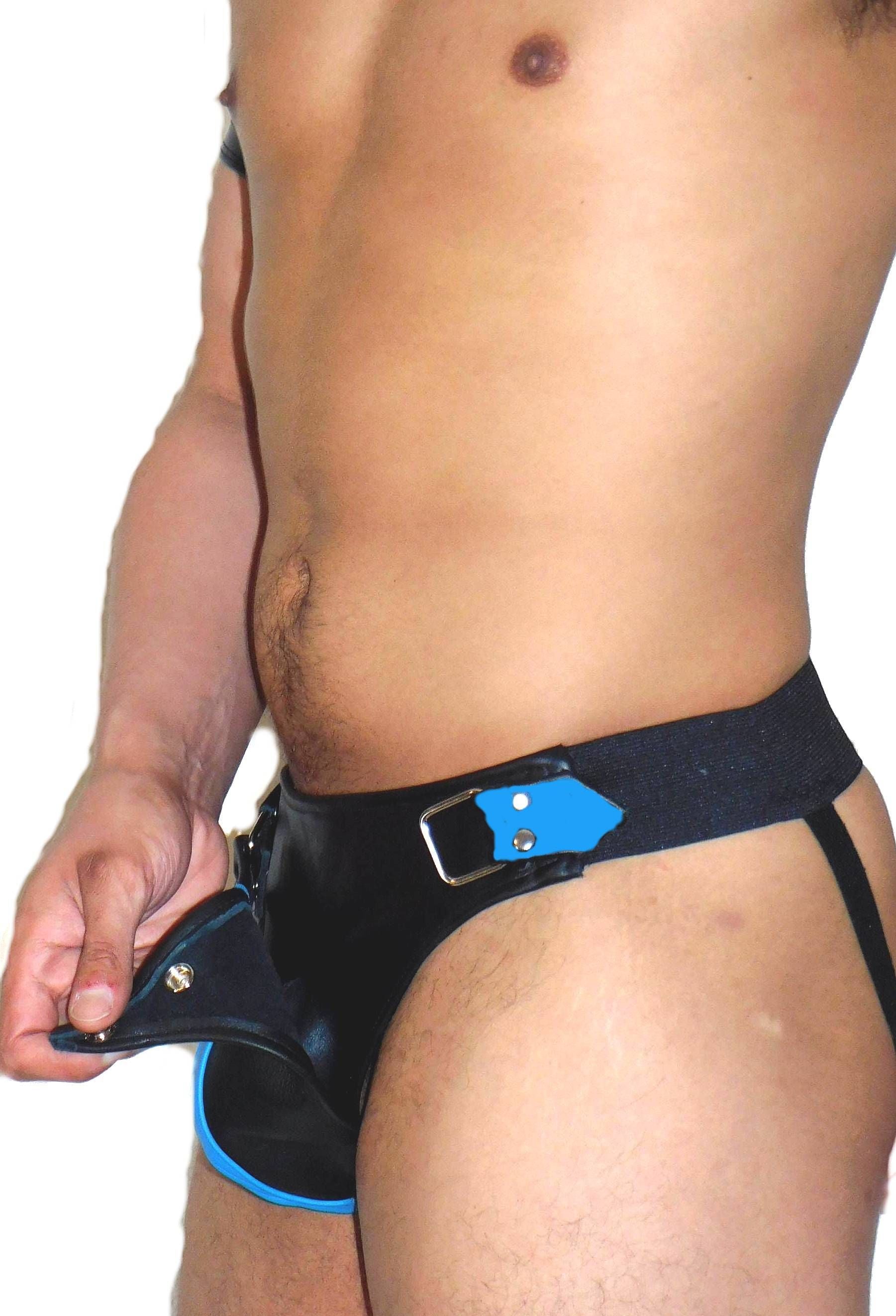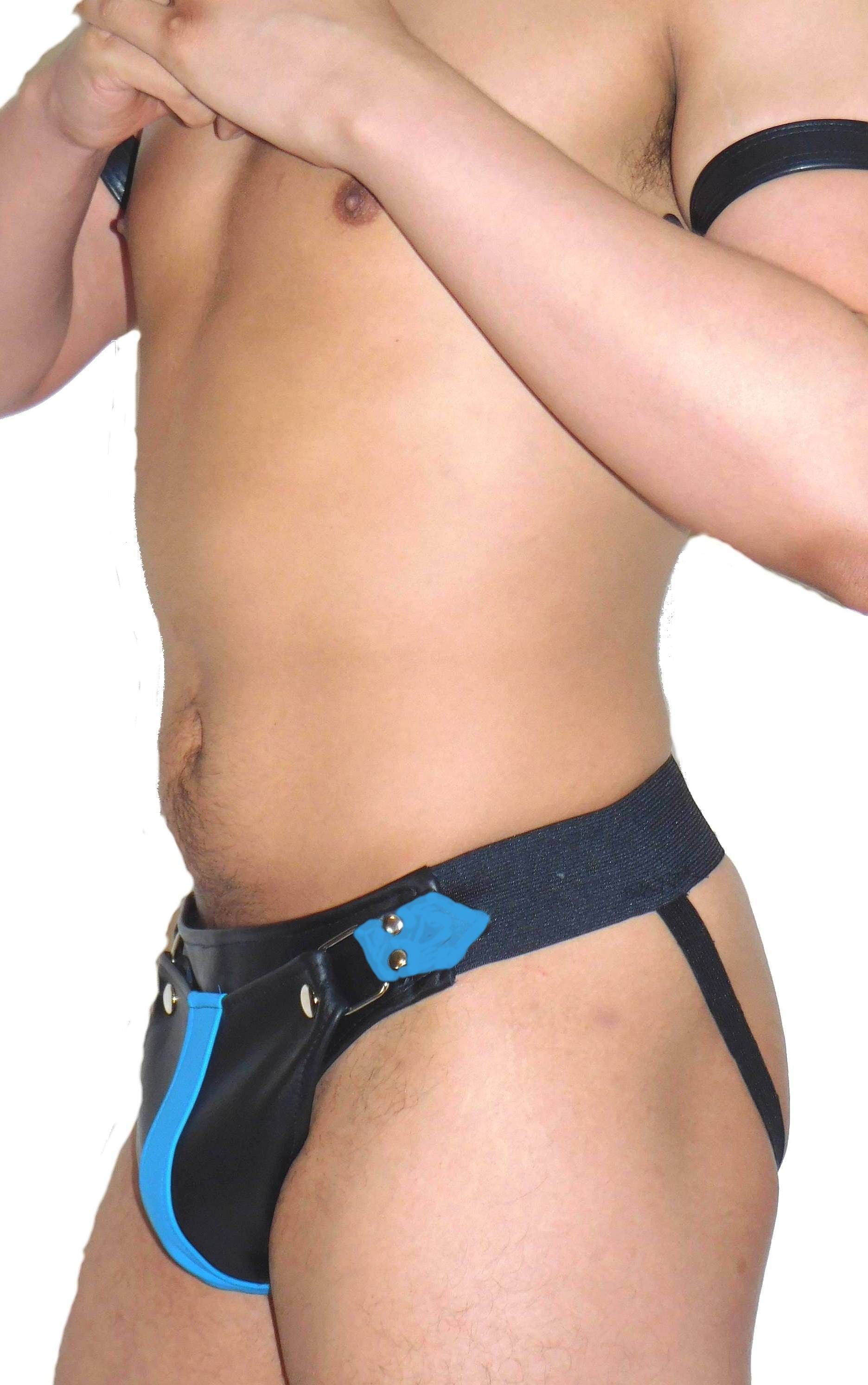 It’s extended because a leather strap holds the codpiece in place. The leather is a bit heavier than the regular codpiece and the base of the jock has a hole for your junk. The jock has a completely removable codpiece.