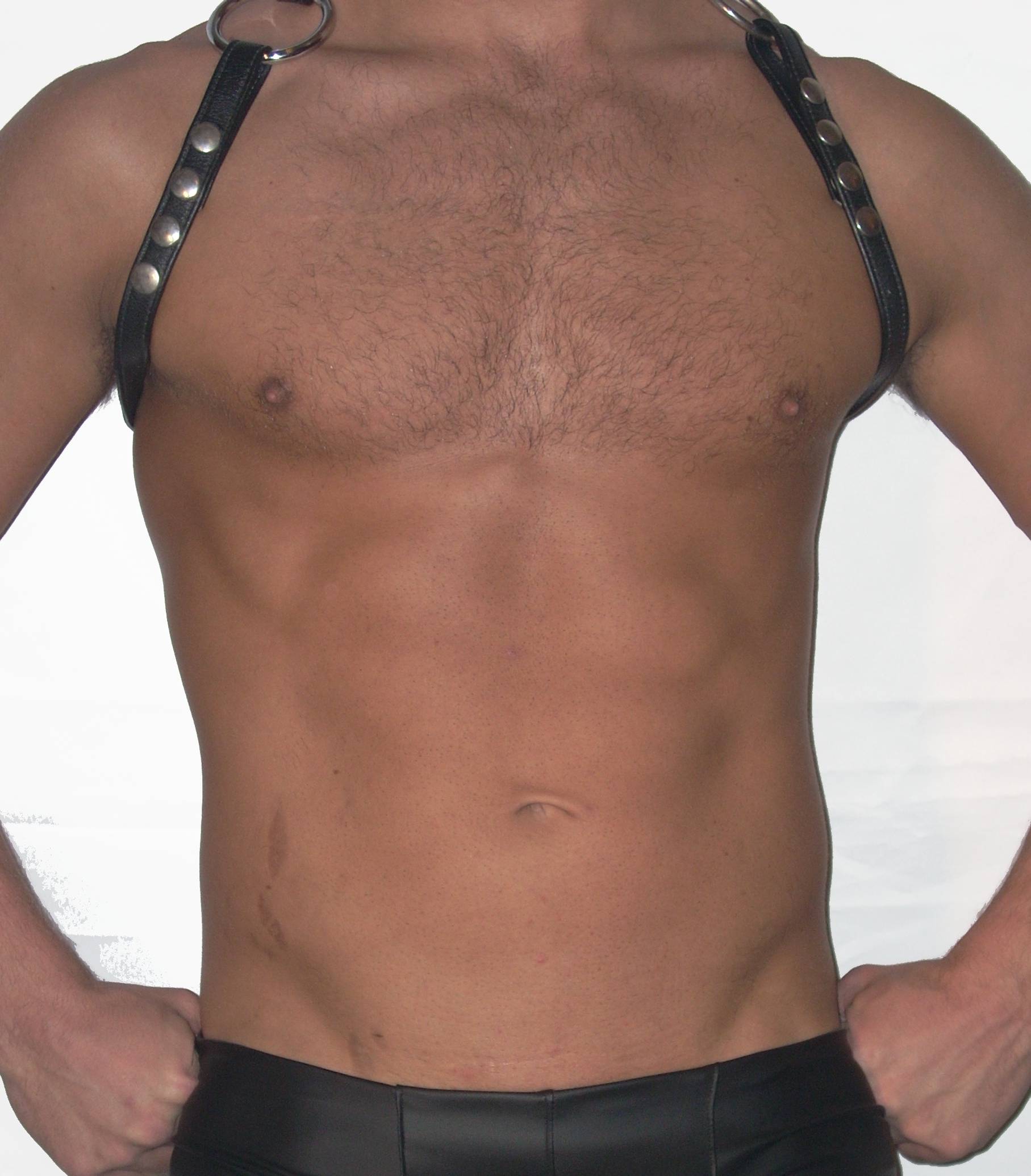 Like a gun holster, this harness only shows the straps around each arm from a front view. Your chest is not covered at all. The back view is very hot. This harness is adjustable with snaps. Very simple design makes it easy to wear.