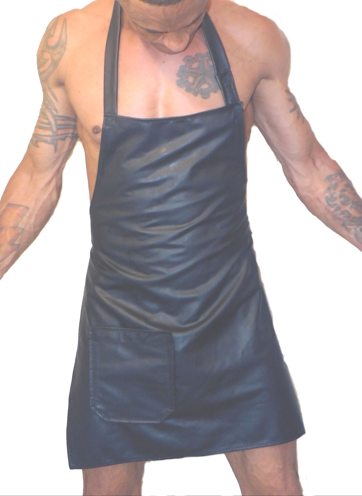 Butcher's Leather Apron is a great piece of leather with an adjustable strap around the neck and a pocket in front. Ties in the back. One Size.