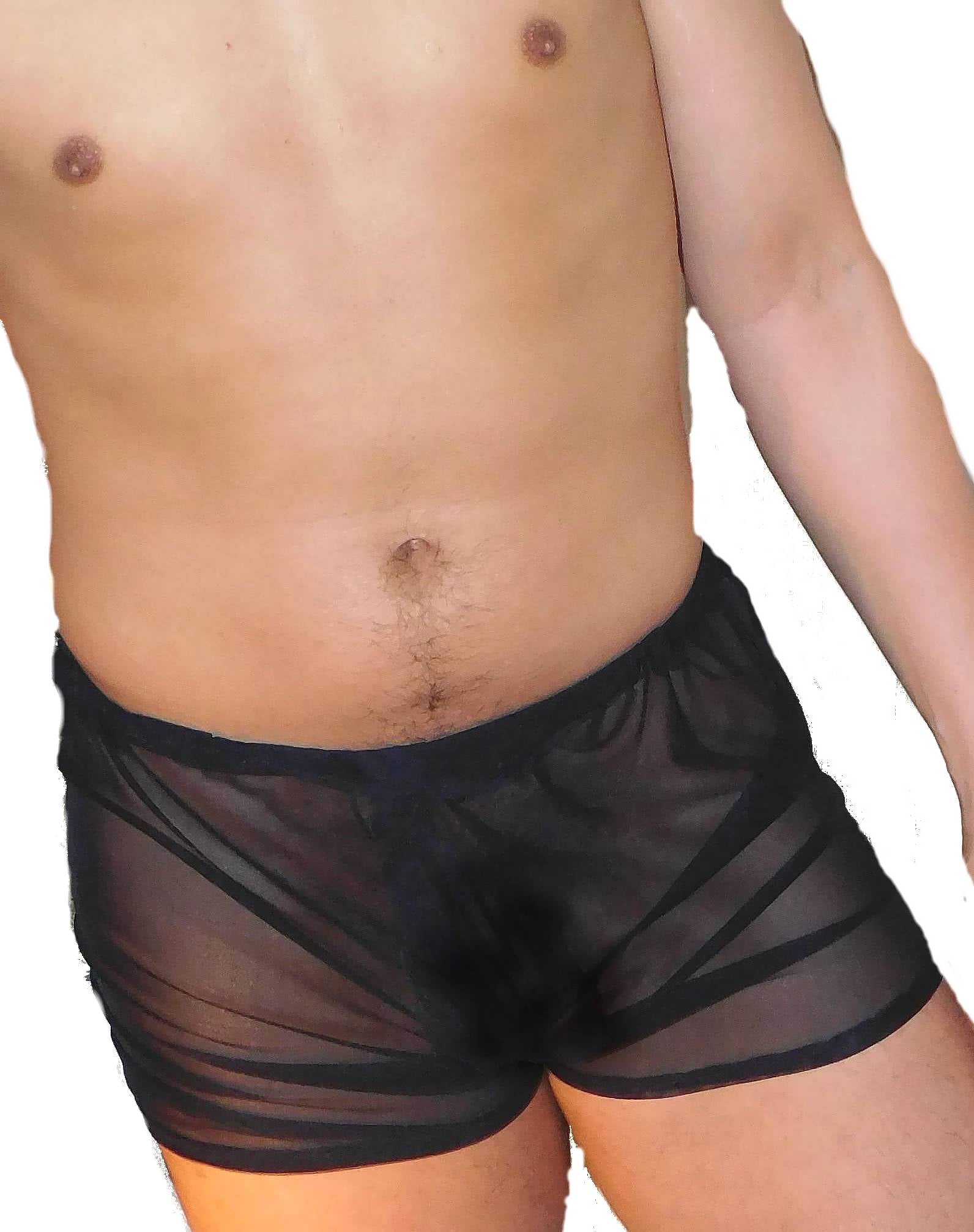 These boxer shorts are very sexy with a loose fit. The fabric is a sheer mesh that feels like air. They have a fly front and an elastic waistband.