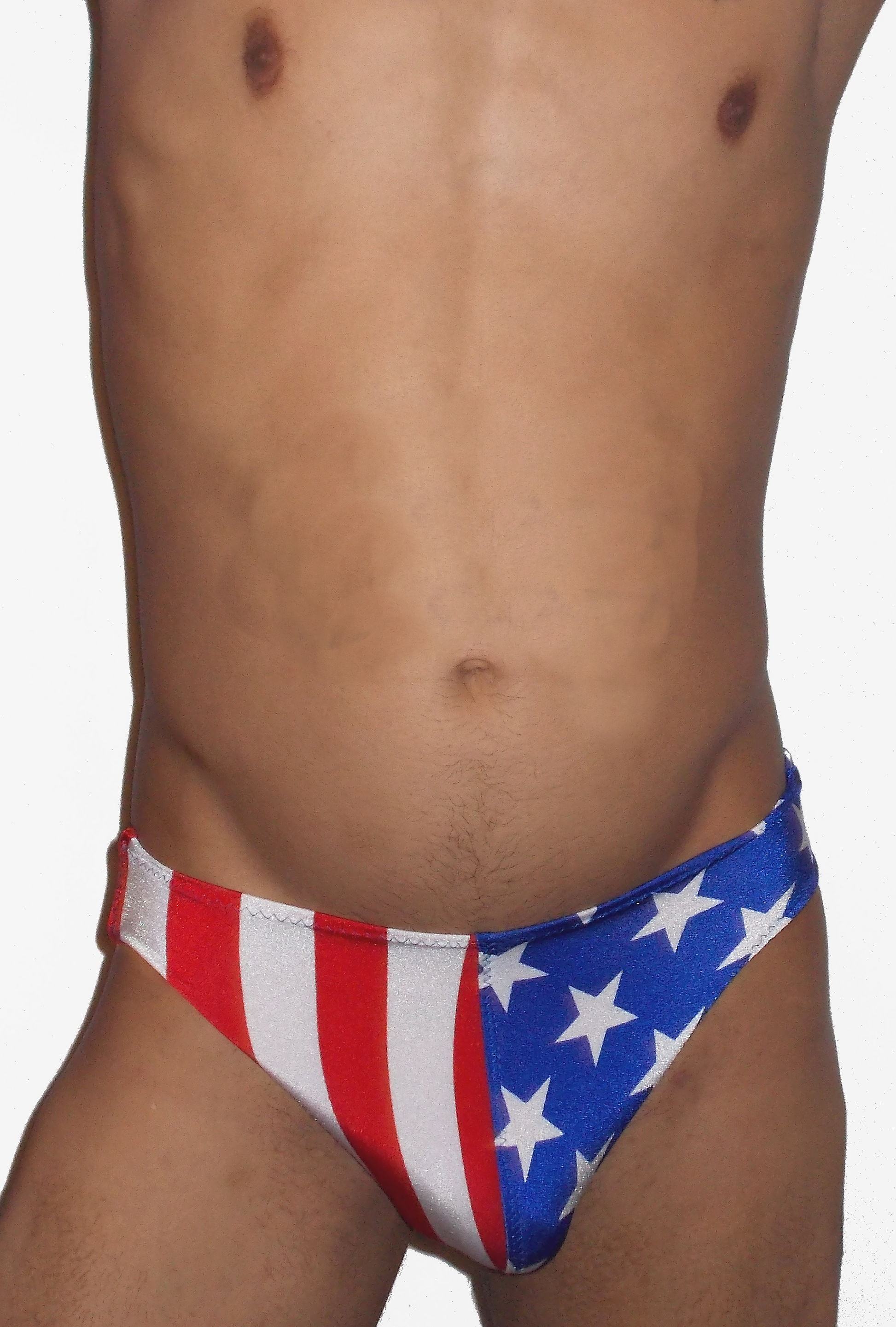 In a standard cut, the back half has the elastic waistband. The stars and stripes jockstrap is blue with white stars on half and the rest is red and white stripes. Black elastic waistband.
