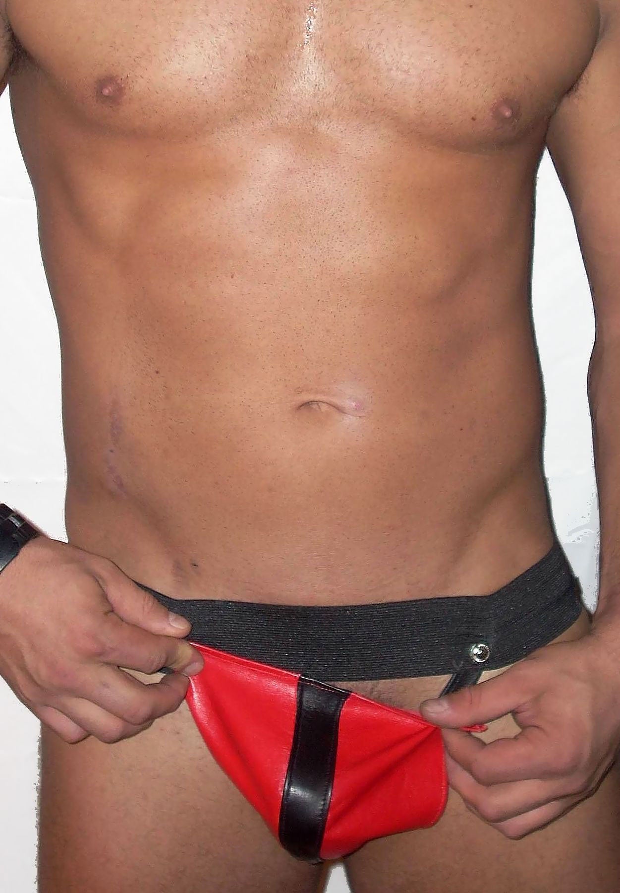 You will have fun with this jockstrap. Contrasting colors of leather with a great stripe. The Leather Pouch in front easily snaps off while you continue to wear the jock totally intact.