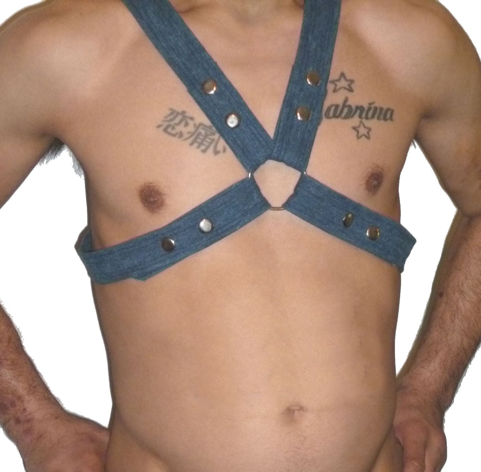 Made with real denim and adjustable with snaps. This harness is something you won't see anywhere else. It forms an "X" shape on you and it's just as sexy as a leather harness, but much more unique.